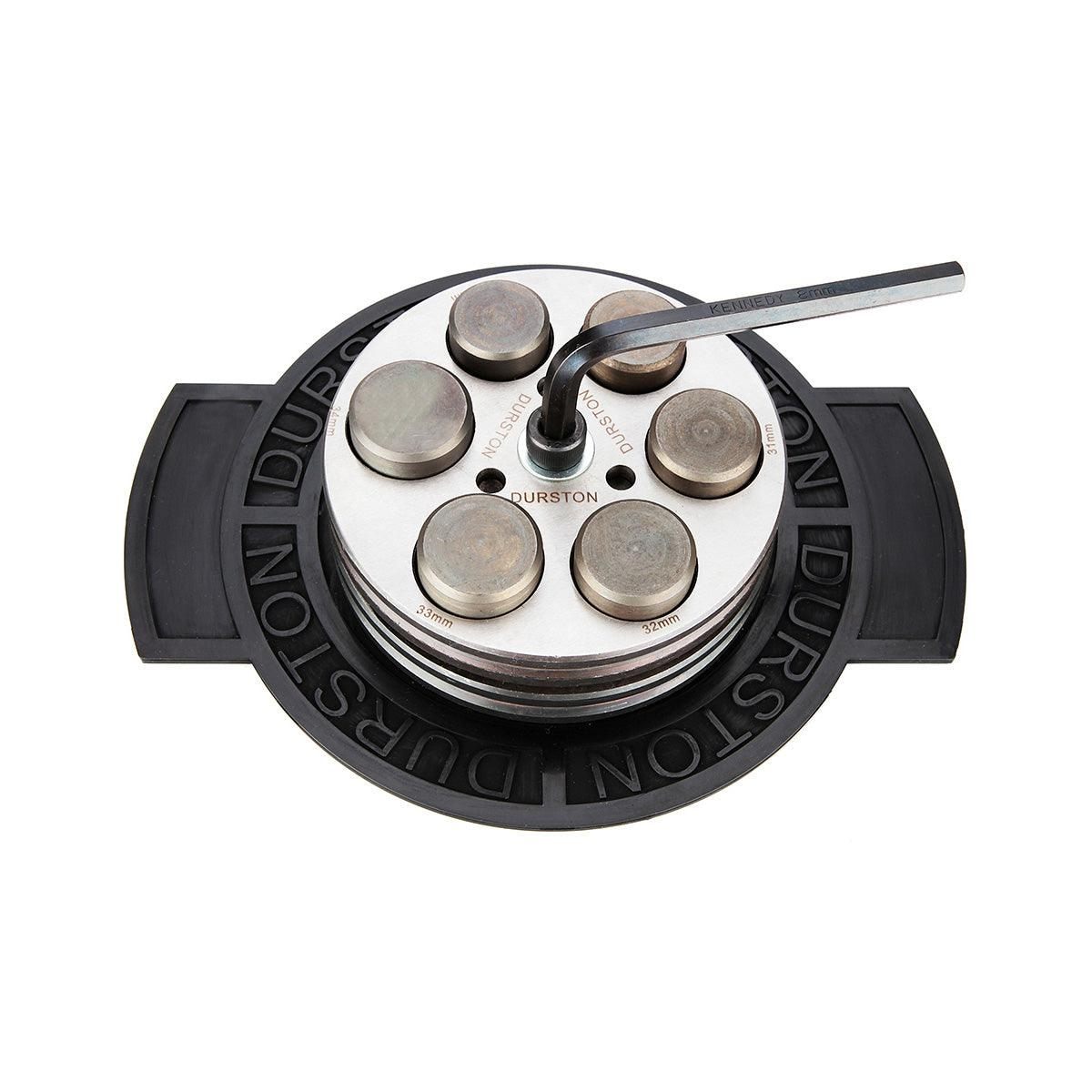 Durston 的圆盘切割机采用创新设计,注重功能性和易用性。每套设备均包含润滑剂,可延长冲头的使用寿命,并配有简易夹紧装置,只需夹紧材料即可使用内六角扳手取出,简化了设置。设备还配有调平垫片,以确保精确对准,为珠宝工坊提供完整的圆盘切割解决方案。本套装包含九个冲头,尺寸从 20 毫米到 28 毫米不等,重约 7.45 公斤。适用于切割厚度不超过 1 毫米的有色金属。请注意,本套装不包含储物托盘。